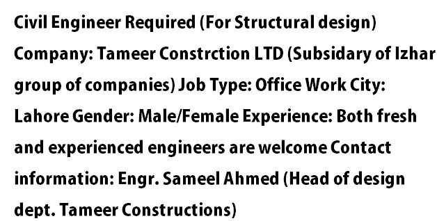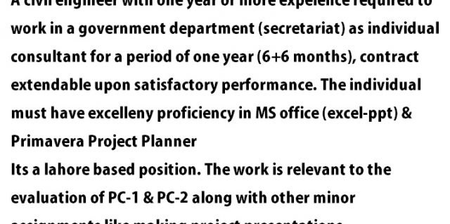 Civil Engineer Required with atleast 1 year experience A civil engineer with one year or more expeience required to work in a government department (secretariat) as individual consultant for a period of one year (6+6 months), contract extendable upon satisfactory Continue reading Civil Engineer Required with atleast 1 year experience