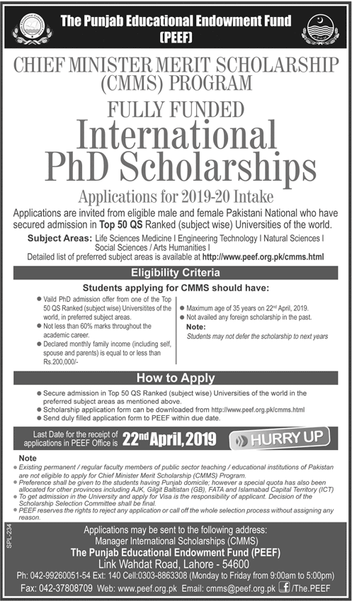 - Valid PhD admission offer from one of the Top 50 (Subject Wise) Universities of the World (QS ranking) in preferred subject areas (www.peef.org.pk/CMMS.html)